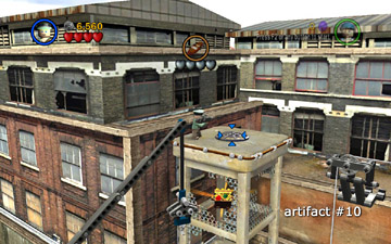 FREE PLAY: As in Story Mode, use a female character to climb the rope near the start. Jump from the rope to the ledge. Then switch to a character with glass-breaking or explosive ability to shatter the windows and get artifact piece #1.
