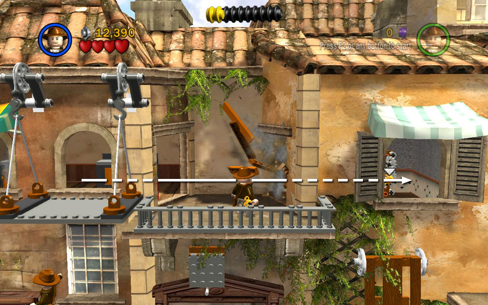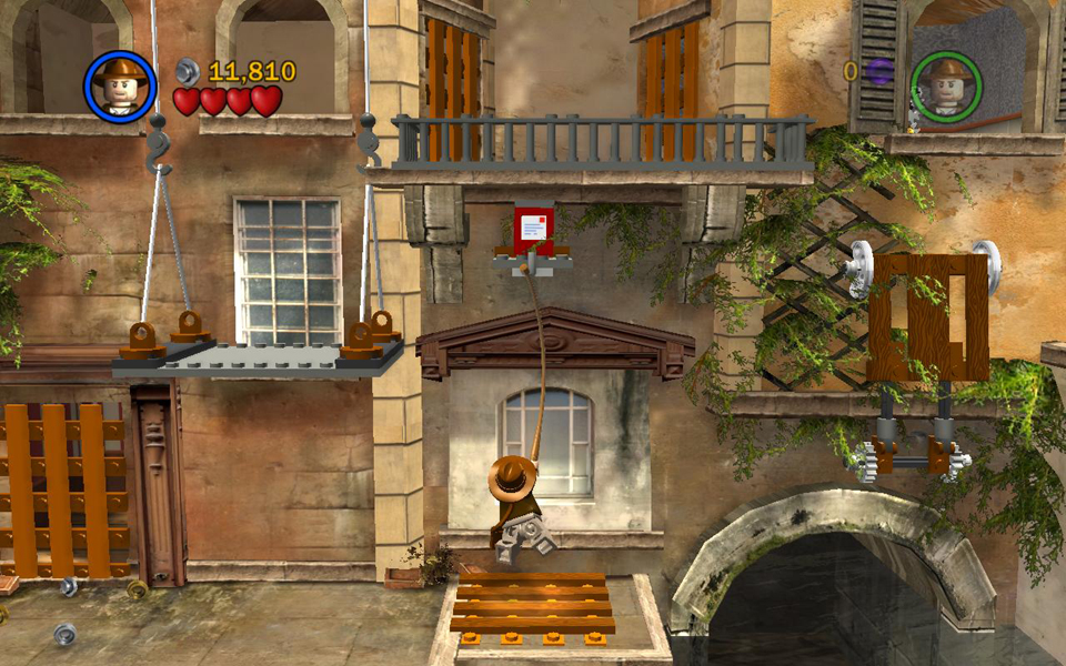Climb out of the water and toggle one character to Indiana Jones. Stand on the whip platform and use the whip to pull down the parcel. Move to the left side of the ledge and smash the boards across the alcove. Pull the lever inside to start the elevator moving.