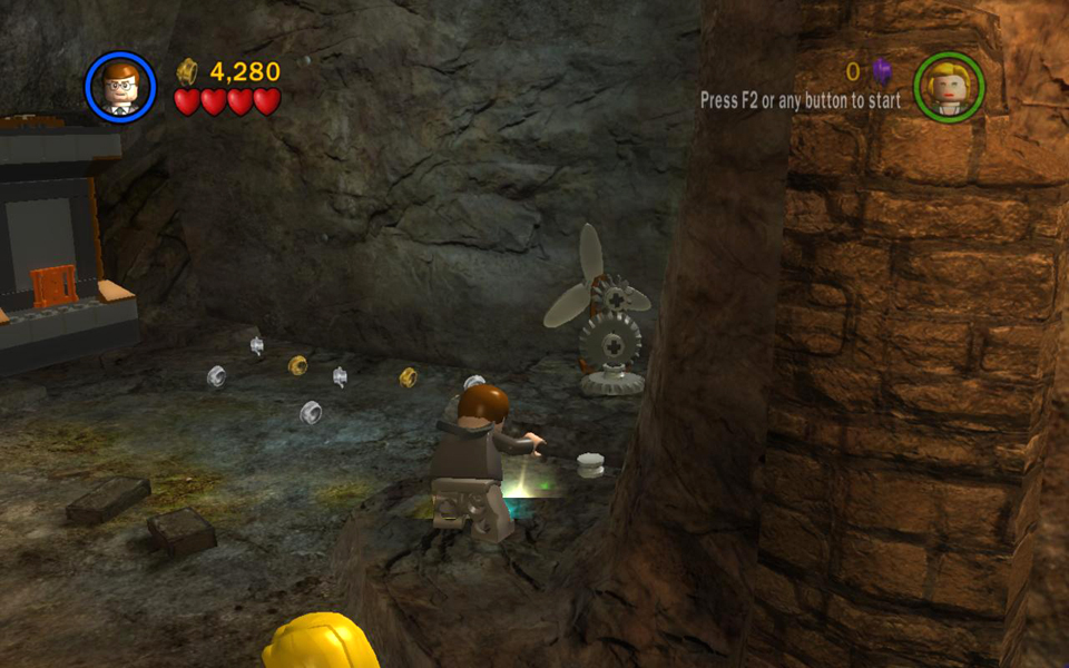 Whether or not you're going after the artifact, smack the first coffin on the right. Spikes pop out, along with a shovel, which is handy for hitting the other coffins. Follow the oily stream to the right. Just before the Kali statue, there's a sparkly patch of ground in the middle of the tunnel. Use the shovel here to dig up a box of LEGO bits.