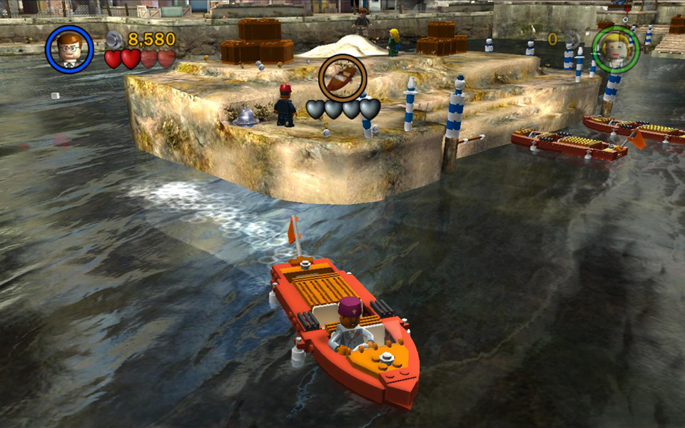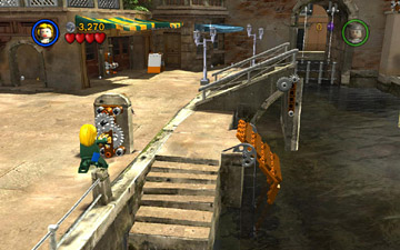 FREE PLAY: Use a character with the explosives or glass-breaking ability to shatter the window on the far right side of the piazza. Get on the motor scooter and ride to the left. You'll notice that a series of orange traffic cones have appeared. Run over all of the cones—including the ones on the other side of the pedestrian bridge—to make artifact piece #3 appear in the alcove near the first lever.