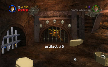 To obtain artifact piece #6, located behind the bars just to the left of the starting point, explosives won't do. Instead you must find 5 LEGO skeletons hidden throughout this area. Each time you find one, one of the 5 small skulls decorating the barred alcove turns around to show its face. When you find all five, the bars open.
