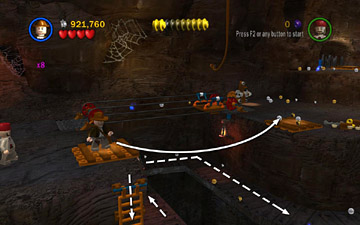 Head to the right and carefully retrieve the purple stud sitting on one of the wooden beams spanning the gap. Then continue to the right and whip swing across the gap. Use the pile of LEGO bits on the other side to build a dangling vine. In a co-op game, the player controlling Sallah can climb down the ladder near the whip platform, cross the wooden ledges and then climb up the rope. If you're playing alone, Sallah will do this automatically.