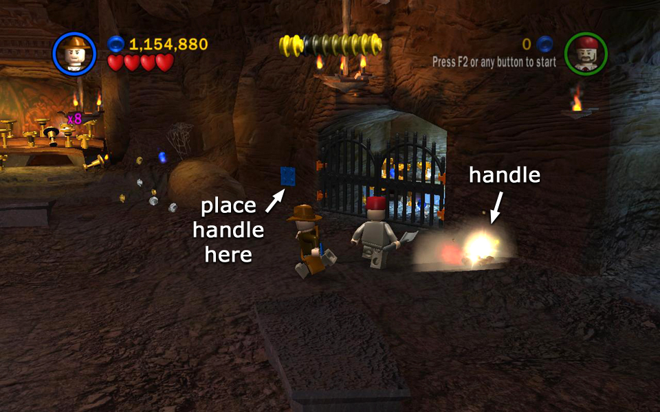 NOTE: In Story Mode, if you have unlocked and activated the "Treasure Magnet" Extra, you can stand near the barred door to attract the purple stud inside without actually having to open the door.