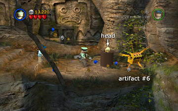 FREE PLAY & SECRET CHARACTER: Before leaving this area, go after another artifact piece. On the right side of the idol room is a doorway blocked by silver bars. These can only be destroyed using explosives. So, later on, be sure to return to this level in Free Play mode after you've unlocked a character with a bazooka or grenades. Blow up the bars and enter the area behind to find artifact piece #6.