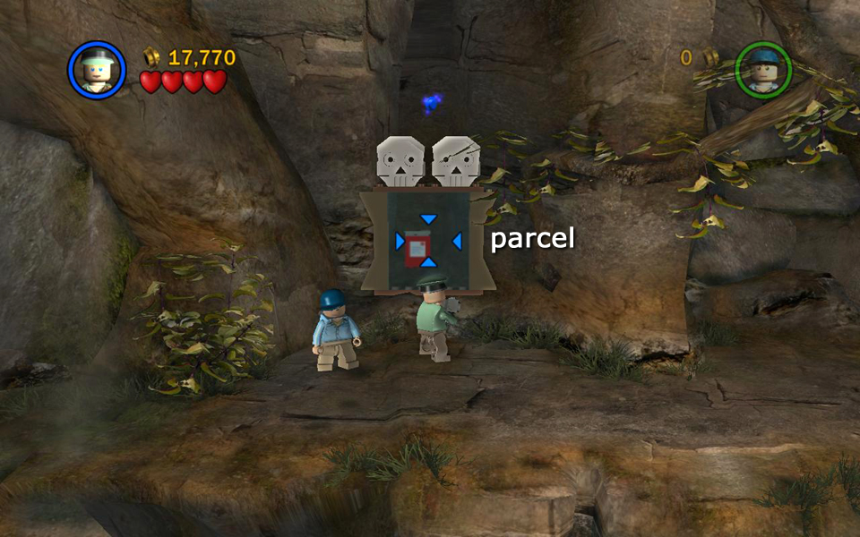 PARCEL: Also in Free Play, use the Kali statue to retract the spikes on the lower level, as described in the section above. Drop down and follow the path to the left, ducking into the alcoves and/or hugging the back wall to avoid the rolling heads. Pass the mailbox for now. A little farther along you'll see the parcel behind a sheet of glass. Switch to a character with the explosives or glass-breaking ability and shatter the glass to get the parcel. Carry it back to the right and place it in the mailbox.