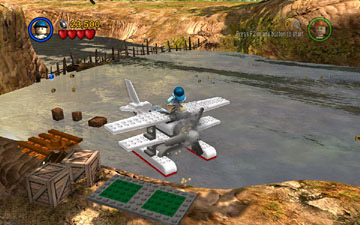 Run to the plane and pick up the box of parts to the right and drop it on one of the green plates. Step onto the whip platform on the left and use Indy's whip to snag the second box of LEGO bits from the post sticking out of the water. Carry it to the other green plate. Now stand next to the pile of LEGO bits and hold the Build button to rebuild the airplane engine.