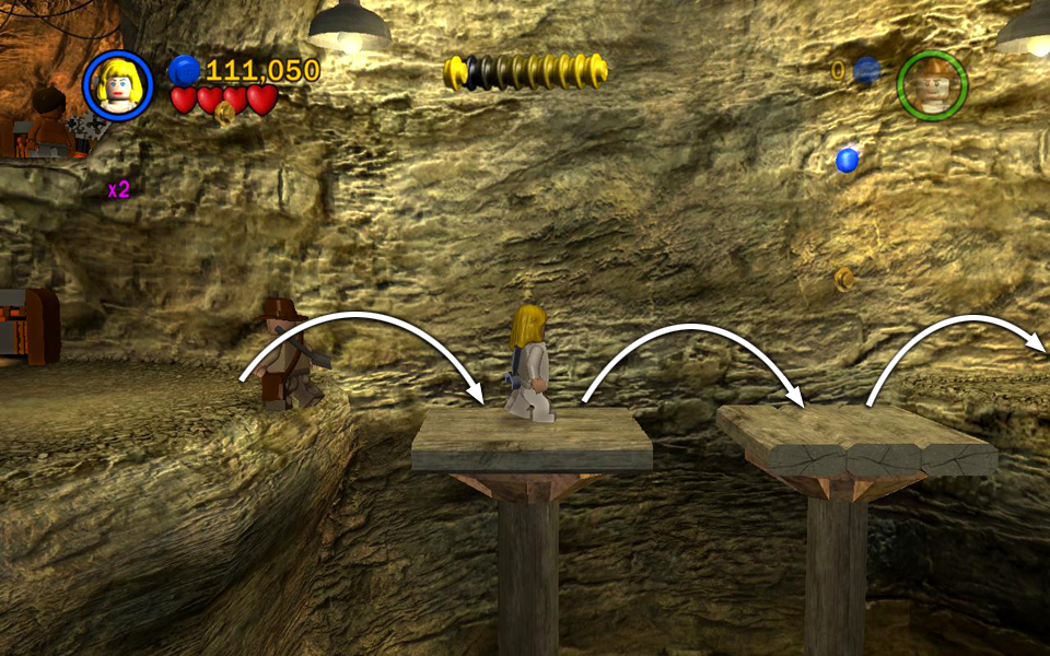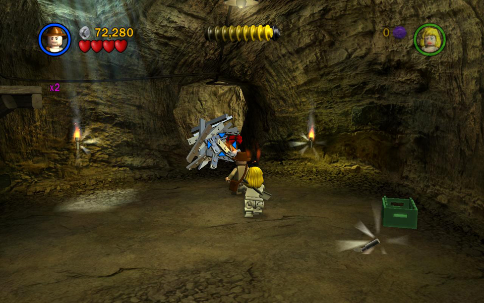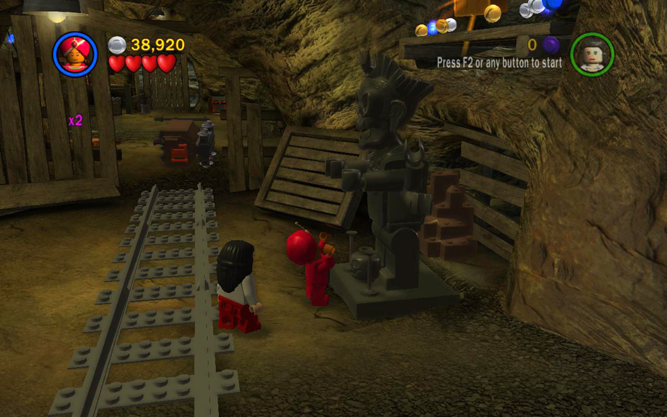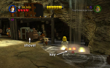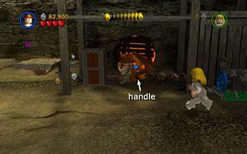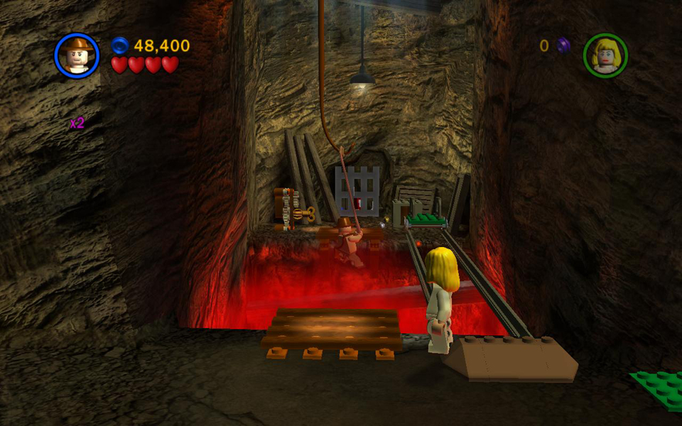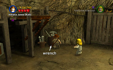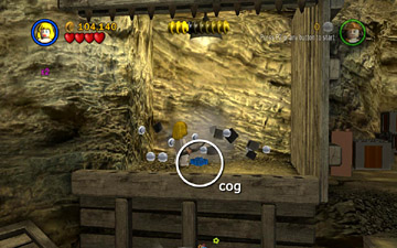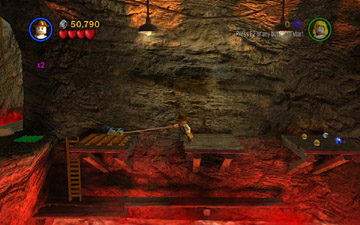 Short Round has been captured by the Thuggee slavers. You now control Indy and Willie. Use Willie's super jump to reach the ledge on the left. Then use the LEGO bits build a handrail so Indy can climb up. Pick up the box of bits on the right, behind the mine cart, and drop it on one of the green LEGO plates. Position Indy on the whip platform and use the whip to pull the ring above. This raises the wooden platform on the left.