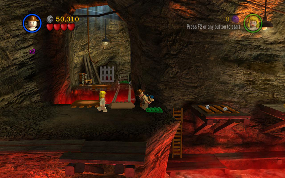 FREE PLAY: While standing on the small platform above the lava, switch to a small-sized character and wriggle through the crawlspace to emerge on a higher ledge, where you'll find artifact piece #1. From here, you can jump directly down into the next part of the tunnel, skipping the handrail above the lava pool.