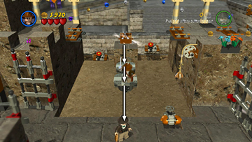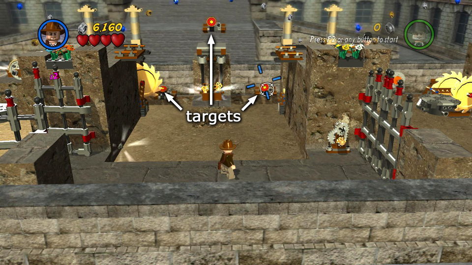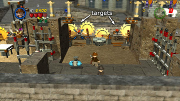 Shooting these targets drains the mud from all the pools and fills them with water. It also lowers the gray platform above the pool. Hop onto it and use Indy's whip to pull the orange ring between the saw blades. This opens the next gate on the right.