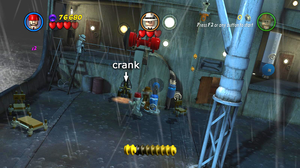 LEVEL ENTRANCE: The story begins aboard the S.S. Coronado on storm-tossed seas. Use Indy's whip to pull the orange ring and open a hatch. Step inside and Indy will be blown out of the smokestack onto the upper deck. If you don't manage to get the hovering studs on the right, just climb up on the left and use the orange ring on the mast to swing out over the smokestack. The updraft should then carry you over to the studs. You can also turn the gold key to get a few extra studs. Hop down on the right and follow the green arrow into the level. (See the Story Level Intro if you need visuals.)