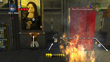 If you like you can turn the gold key on the player piano to play some music and get a few extra studs. Then smash the weapon rack next to the piano and step into the alcove behind it to get a purple stud. Smack the bookshelves on the back wall until all the books fall out onto the floor. Then replace them, spelling out the word 'INDY' with books, and gaining scads of studs in the process. Unless you're racing against the clock, smash the rest of the furniture on this side of the flames to get all the available studs.