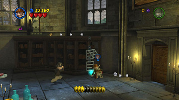 Before leaving, take a few moments to pick up any studs you haven't already retrieved. There are several hidden behind the long table, and if you hit the bookshelf on the far right, you can then stack the loose books and use them to reach the top of the shelf. From there, you can jump up to get the hovering blue stud. The weapon racks and the standards with the purple banners are also breakable.