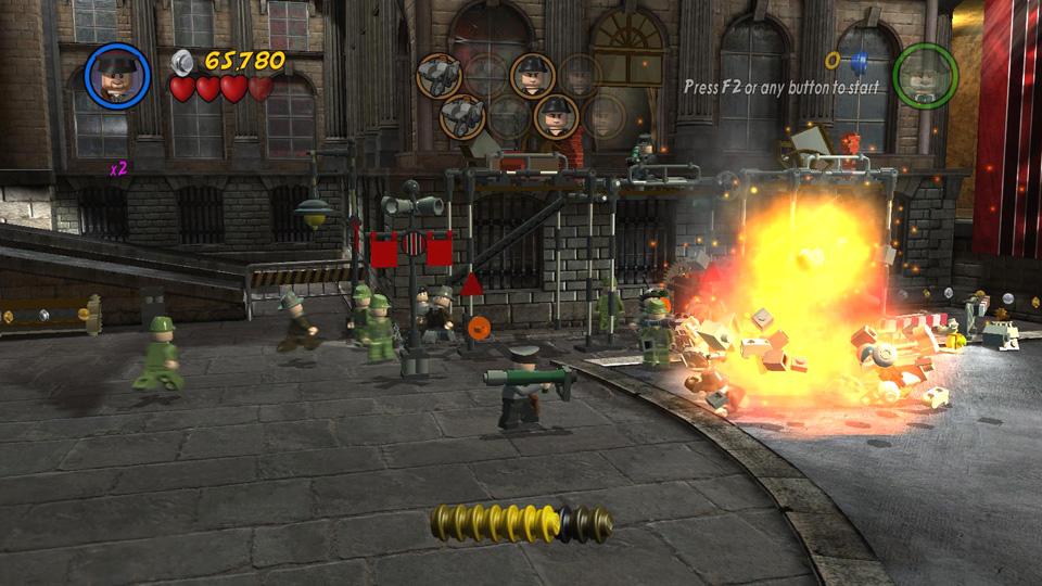 The bazooka troopers and riflemen emerge from the second-story windows and take up positions on the scaffolding at the left and right ends of the street. First head to the left and smash the red-and-white barricades below the scaffolding. Notice the 3 orange rings. Use Indy's whip to pull the middle ring directly below where the first bazooka trooper is standing. This collapses the scaffold, dropping the trooper to the ground so you can fight him and hopefully steal his bazooka. Then use that weapon to shoot the second trooper, who comes out to take the other's place. If you don't manage to grab the weapon in time, you can also whip the orange ring again to collapse the scaffold. Then fight the soldier on the ground and take his weapon.