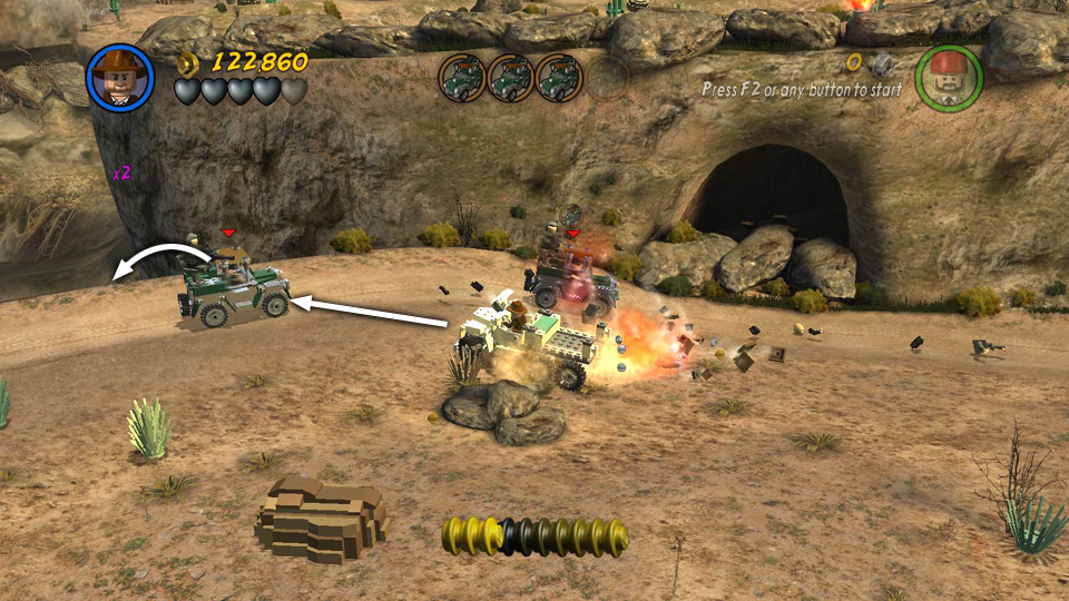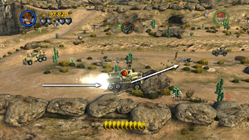 Your trusty steeds are cute but they're no use against the 2 enemy jeeps with mounted guns. So move close to one of the parked Jeeps and press Free Tag to take control of it. The LEGO boulders blocking the road at the bottom of the clearing prevent the enemies from doing anything but driving in circles. So they're not too hard to beat. Just crash into them several times until they explode.