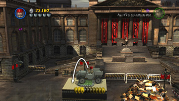 Now for the first vehicle. Use Sallah's shovel to dig the Jeep out from under the pile of books in the middle of street. If you like, you can drive around crashing into things to get more studs before moving on. Just be careful not to drive back through the entrance and quit the level prematurely.